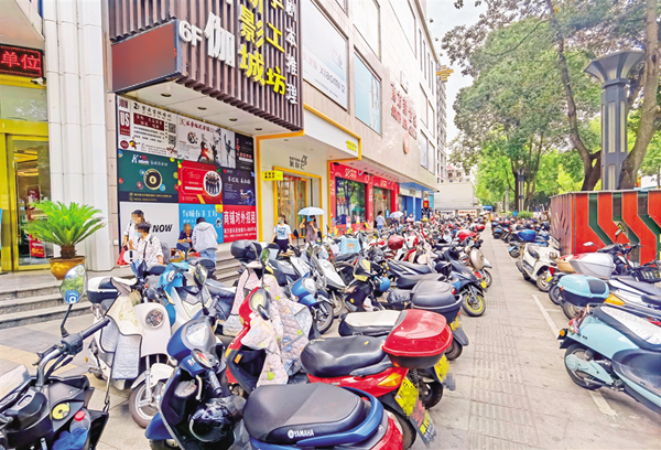 6月18日,在安康城區(qū)金州南路人行道上,部分車(chē)輛占用盲道、車(chē)身超出停車(chē)線(圖1),未按要求停放車(chē)輛(圖2),造成了安全隱患。(記者 張喬 攝)