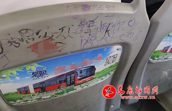 7月7日,筆者乘坐安康市城區(qū)7路公交車發(fā)現(xiàn),公交座椅靠背慘遭“涂鴉”,內(nèi)容不乏廣告標(biāo)語、低俗粗鄙、不堪入目的語言,嚴(yán)重影響乘車心情。希望廣大乘客文明乘車,還市民一個(gè)干凈整潔的乘車環(huán)境。(通訊員 成忠旭)