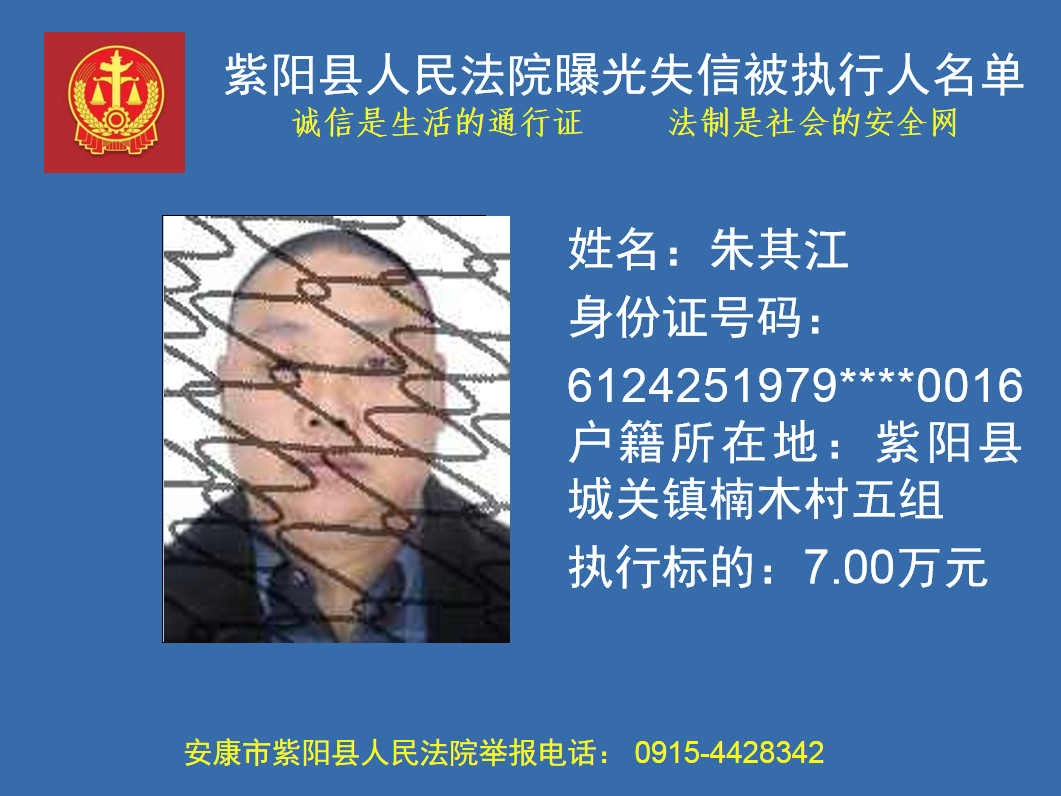 曝光失信 | 紫陽縣人民法院:關(guān)于敦促朱其江履行法定義務(wù)的公告