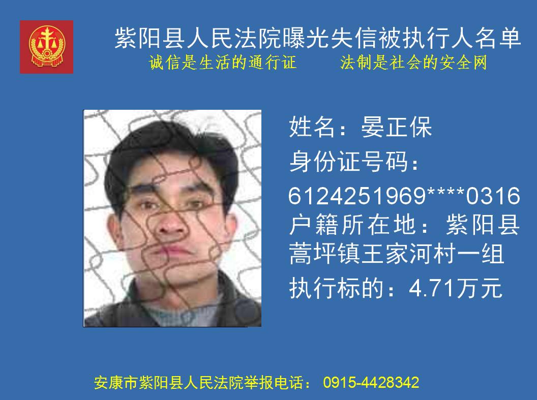 曝光失信 | 紫陽縣人民法院:關于敦促晏正保履行法定義務的公告