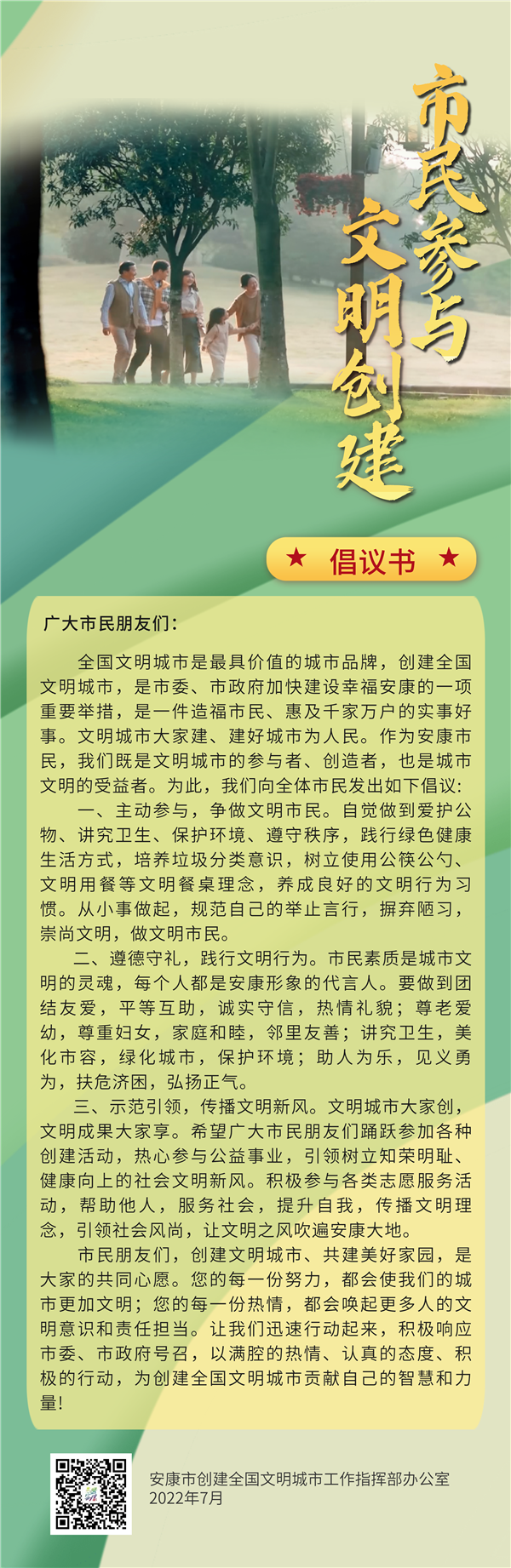 全國文明城市是最具價值的城市品牌,創(chuàng)建全國文明城市,是市委、市政府加快建設幸福安康的一項重要舉措,是一件造福市民、惠及千家萬戶的實事好事。文明城市大家建、建好城市為人民。作為安康市民,我們既是文明城市的參與者、創(chuàng)造者,也是城市文明的受益者。為此,我們向全體市民發(fā)出如下倡議:??