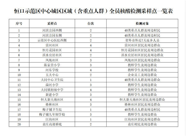 共設(shè)置20個(gè)采樣點(diǎn)、53個(gè)采樣臺(tái)(見(jiàn)附件),由相關(guān)責(zé)任單位統(tǒng)一負(fù)責(zé)采樣點(diǎn)設(shè)置、人員組織、秩序維護(hù),檢測(cè)對(duì)象按現(xiàn)場(chǎng)工作人員要求,有序到指定地點(diǎn)進(jìn)行采樣,避免人員聚集。