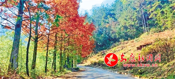 車子沿著山路繼續(xù)往上,途中時(shí)不時(shí)掠過(guò)一排排水杉,水杉的顏色有綠有黃、有深有淺,高大挺拔、直入云端。偶爾有幾棵同類型品種夾雜其中,已全然呈現(xiàn)出上下一體的棕黃色。在太陽(yáng)的照射下,仿佛是身披金黃鎧甲的戰(zhàn)士,堅(jiān)韌有力。枝葉在微風(fēng)中輕搖,沙沙地響,視聽(tīng)一體的感覺(jué),不覺(jué)教人沉醉其中。