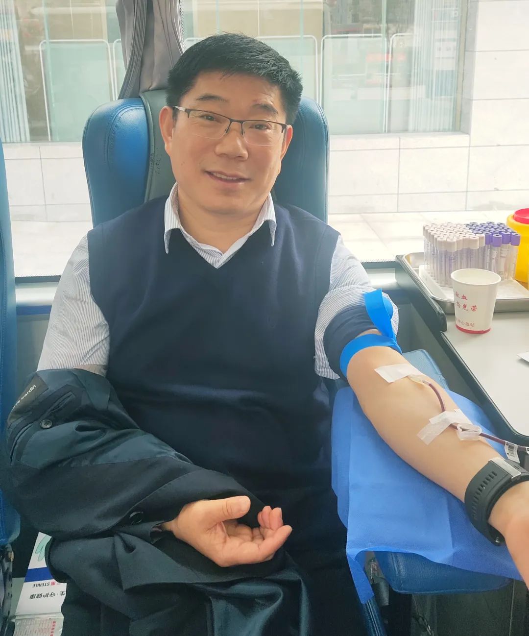 初冬的早晨寒意已顯,但獻(xiàn)血車上卻暖意盎然,來獻(xiàn)血的醫(yī)護(hù)人員大多是固定獻(xiàn)血者,每年單位組織獻(xiàn)血活動他們都不曾缺席,盡管手頭工作很忙,但大家都盡量擠出時間來捐獻(xiàn)熱血。有的人一查完房就趕來,有的人剛下夜班準(zhǔn)備先獻(xiàn)了血再回家,有的人在休假還特意來到單位奉獻(xiàn)愛心。對獻(xiàn)血流程非常熟悉的他們還會叮囑初次獻(xiàn)血的同事要多喝水要放輕松,整個活動氛圍既溫馨又熱情。
