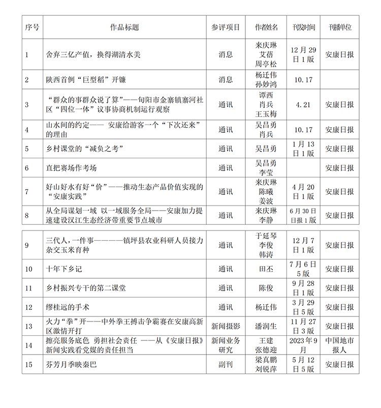 經(jīng)過(guò)1月30日編委會(huì)推薦、社黨委研究決定,擬推薦以下15件新聞作品參評(píng)2023年度“陜西新聞獎(jiǎng)”。公示時(shí)間從2024年1月31日至2024年2月5日,公示期為5個(gè)工作日。如有不同意見(jiàn),請(qǐng)向安康日?qǐng)?bào)社機(jī)關(guān)紀(jì)委、新聞管理部反映。