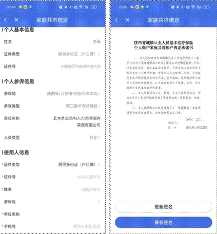進(jìn)入信息填寫頁面后確認(rèn)本人及使用者信息,包括證件號、姓名、參保地、單位名稱(居民直接填寫社區(qū)信息)、手機(jī)號、開始日期、結(jié)束日期、順位支出等。綁定信息填寫完成后,選擇“查看個人承諾書并完成簽名”,進(jìn)入電子承諾書界面,閱讀承諾書信息后,點(diǎn)擊“簽名”按鈕完成電子簽名,點(diǎn)擊“保存簽名”后提交綁定信息。