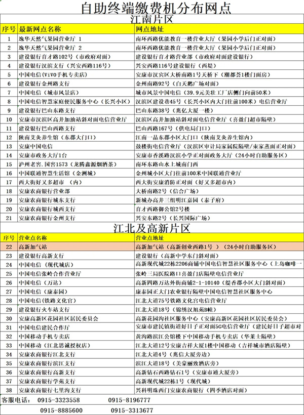 為進一步方便廣大用戶購買天然氣,我公司在電信營業(yè)廳、建設銀行、農商銀行及便民服務點等網點布設38臺天然氣自助終端繳費機?,F溫馨提示您關注“安康市逸華天然氣有限公司”微信公眾號查看自助機分布網點,選擇就近網點進行天然氣充值。其他業(yè)務可在工作時間內前往以下人工服務大廳或窗口辦理,部分業(yè)務也可通過微信公眾號的“微營業(yè)廳”辦理: