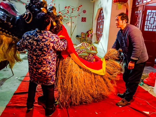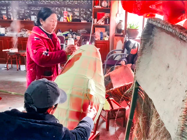 “龍頭是整條龍的重點,刻畫要逼真,色彩還得鮮艷。忙碌了一年的鄉(xiāng)親們,就希望在正月里,抖擻精神,舞動起來?!闭f話間,李忠寶一雙巧手上下翻飛,正在修剪龍頭花燈的胡須,忙得額頭沁出了汗珠。兒子李石磊則忙著幫烤、粘、填、糊、上色……在他們父子倆的精雕細琢下,一個威風(fēng)凜凜、栩栩如生的花燈道具龍頭,總算扎制完成。