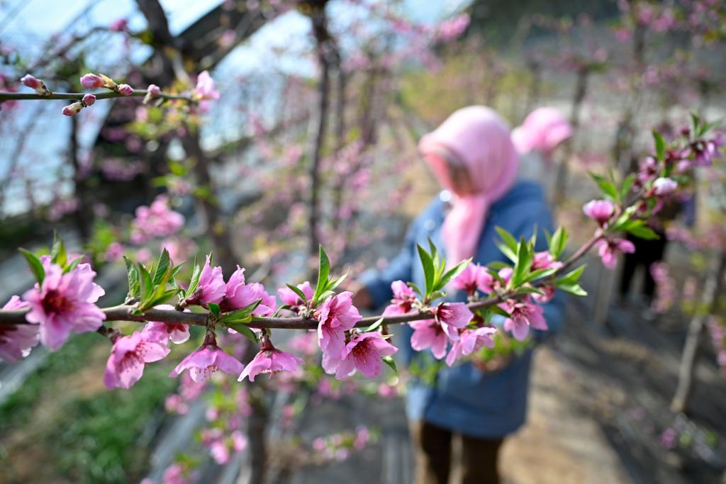 2月24日,在云南省文山壯族苗族自治州文山市馬塘鎮(zhèn)珍珠蜜桃基地,農(nóng)民辛勤護理桃花。春回大地,各地搶抓農(nóng)時,田間地頭一片繁忙勞作的景象。新華社發(fā)(熊平祥攝)