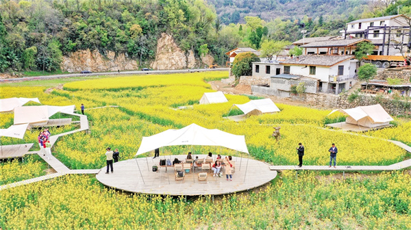 陽(yáng)春三月,秦嶺腳下,春風(fēng)彌漫,油菜花開(kāi)得正旺,朱鹮掠過(guò)古村青瓦。白墻黛瓦的民宿群中,咖啡濃香與油菜花香交織,令游人流連忘返,返鄉(xiāng)青年正在直播推介農(nóng)貨……