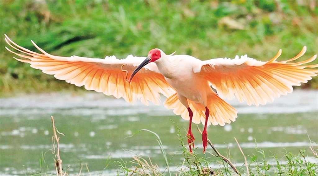 羽毛主要是白色,嘴黑而彎曲,臉和嘴基紅色,翅膀和尾巴粉紅色,腳短且紅色。幼鳥頰部橙黃,腳淺褐色,羽毛呈煙灰色,被譽為“東方寶石”和“吉祥之鳥”。(來源:安康市林學會)