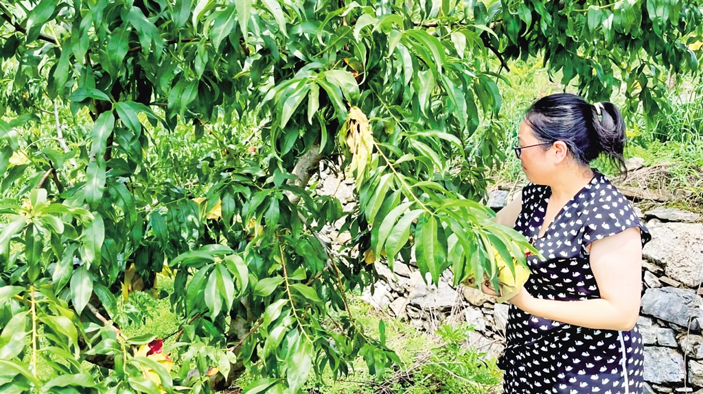 穿過村莊,山坡上500畝桃園綠意盎然?;刎撠熑宋榫昱c工人正采摘套袋?!?017年建設的桃園,今年雖受旱情影響,產量仍達30萬斤,產值約300萬元?!?o:p>