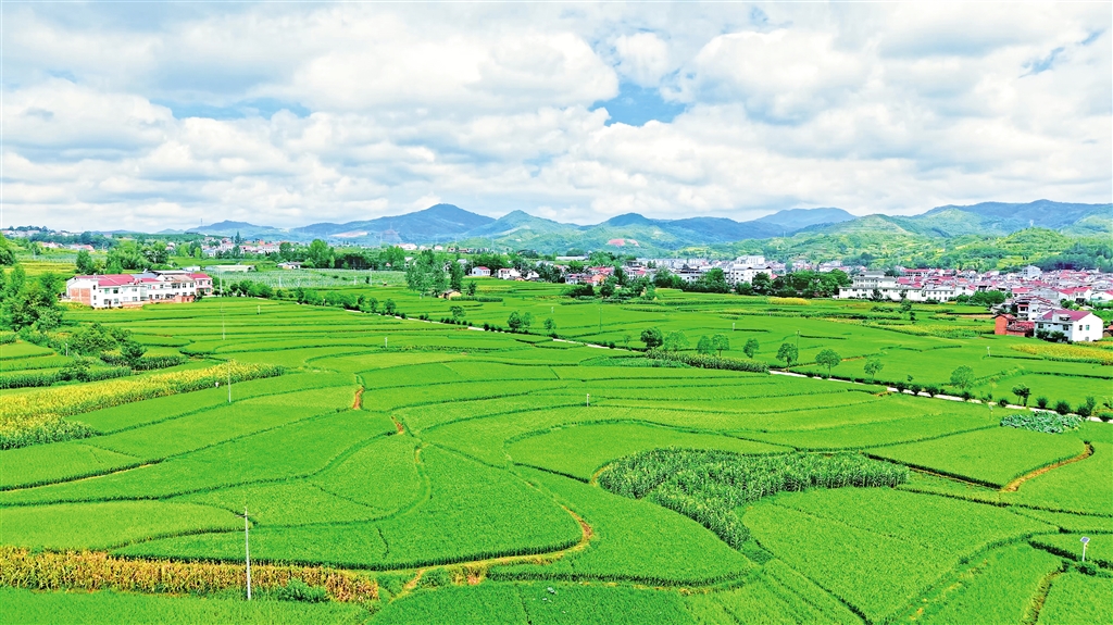 在漢陰縣平梁鎮(zhèn)新河村,連片的綠色稻田與藍天白云相映成趣,勾勒出一幅生機盎然的田園畫卷。王建霞 黃智發(fā) 攝