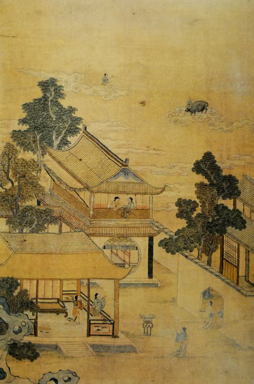 北京故宮博物院收藏的清代緙絲七夕乞巧圖軸,將天上和人間完美融合:上半部分是天上,牛郎織女在祥云圍繞下相會,眼神中充滿了深情和眷戀;下半部分是人間,幾位婦女或憑欄遠眺,或?qū)掌蚯?,一派和諧景象。這幅圖軸以緙絲工藝展現(xiàn),色彩豐富、線條細膩,不僅展現(xiàn)了古人高超的技藝,也反映了當時社會對七夕節(jié)的重視和人民對美好生活的向往。