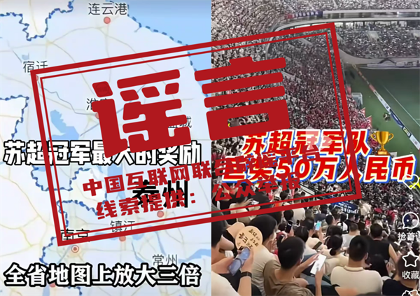 辟謠:地圖放大三個字號?獎金五十萬?這些網(wǎng)傳蘇超冠軍隊獎勵都是假的!