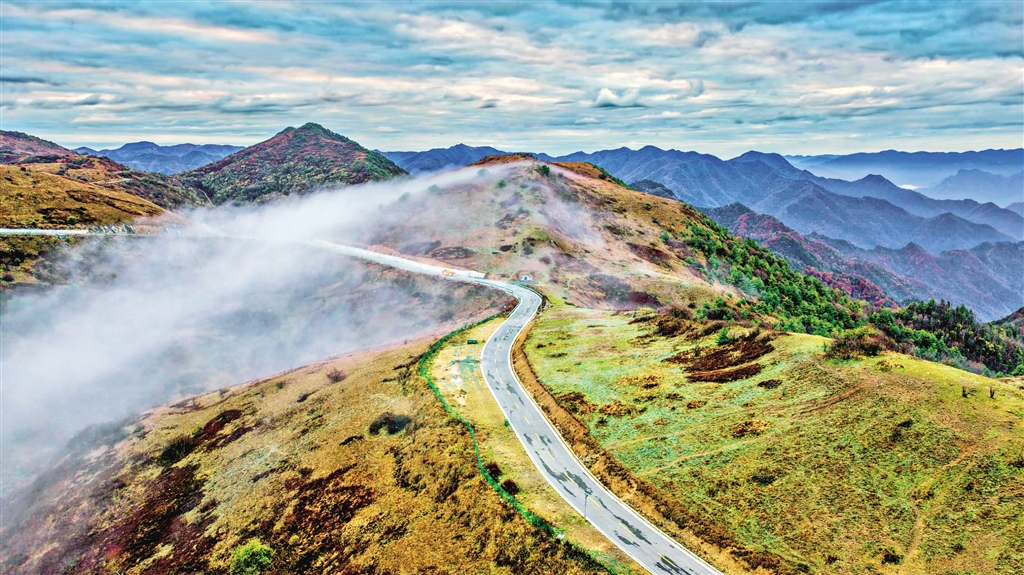 近日,薄霧如紗般漫過(guò)平利縣正陽(yáng)草甸山脊上的盤山道。近年來(lái),當(dāng)?shù)卮罅Πl(fā)展旅游交通,方便更多游客前來(lái)領(lǐng)略秦嶺巴山的雄渾壯美。皮勇維 攝