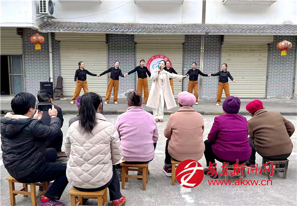 首場活動在城關鎮(zhèn)湯坪社區(qū)拉開帷幕。上午9點,演出團隊的小巴剛開進社區(qū)院子,志愿者們就迅速布置起臨時舞臺。隨著音樂聲響起,原本安靜的院子漸漸熱鬧起來,居民們?nèi)齼蓛蓢鷶n過來。暖陽下,志愿者早就擺好整齊的凳子,等候老人們?nèi)胱?/p>