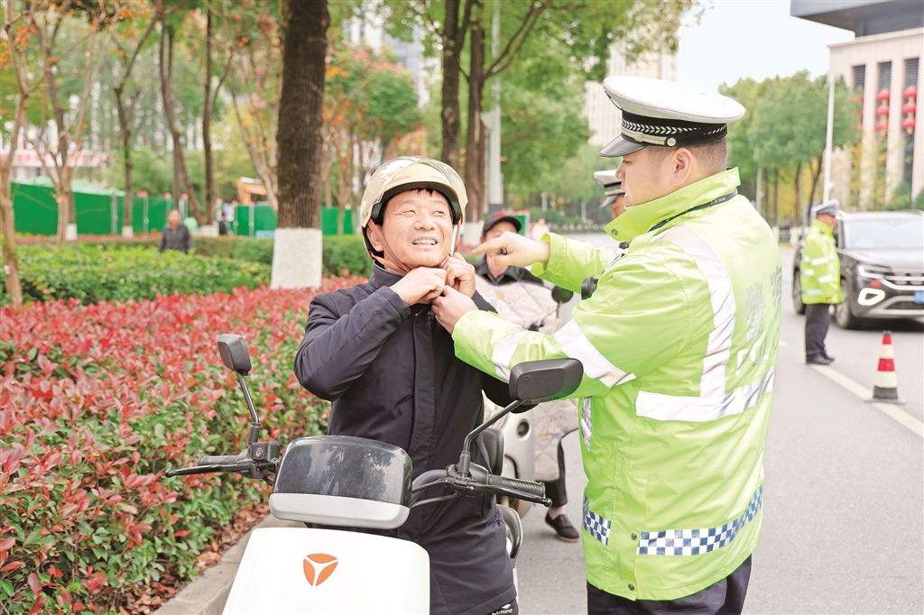 交警在校園門口檢查“一盔一戴”