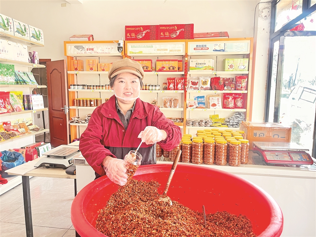 生意有了起色,丈夫的身體也逐漸康復(fù),生活終于重新亮堂起來。作為鎮(zhèn)人大代表,劉小洪深知,一人富不算富,大家富才是真的富。她主動(dòng)分享直播帶貨經(jīng)驗(yàn),帶動(dòng)周邊村民參與特產(chǎn)加工和網(wǎng)絡(luò)銷售。她優(yōu)先聘請(qǐng)村里的留守婦女和困難家庭來幫忙,手把手教她們技術(shù)。為了保證產(chǎn)品的純正鄉(xiāng)味,她堅(jiān)持從本村及周邊村采購黃豆、辣椒、野油菜、干豇豆等原材料,平均每年收購約1萬公斤黃豆、2000余公斤辣椒、2000余公斤野油菜及干豇豆,讓鄉(xiāng)親們的農(nóng)產(chǎn)品有了穩(wěn)定銷路,也變成了實(shí)實(shí)在在的收入。