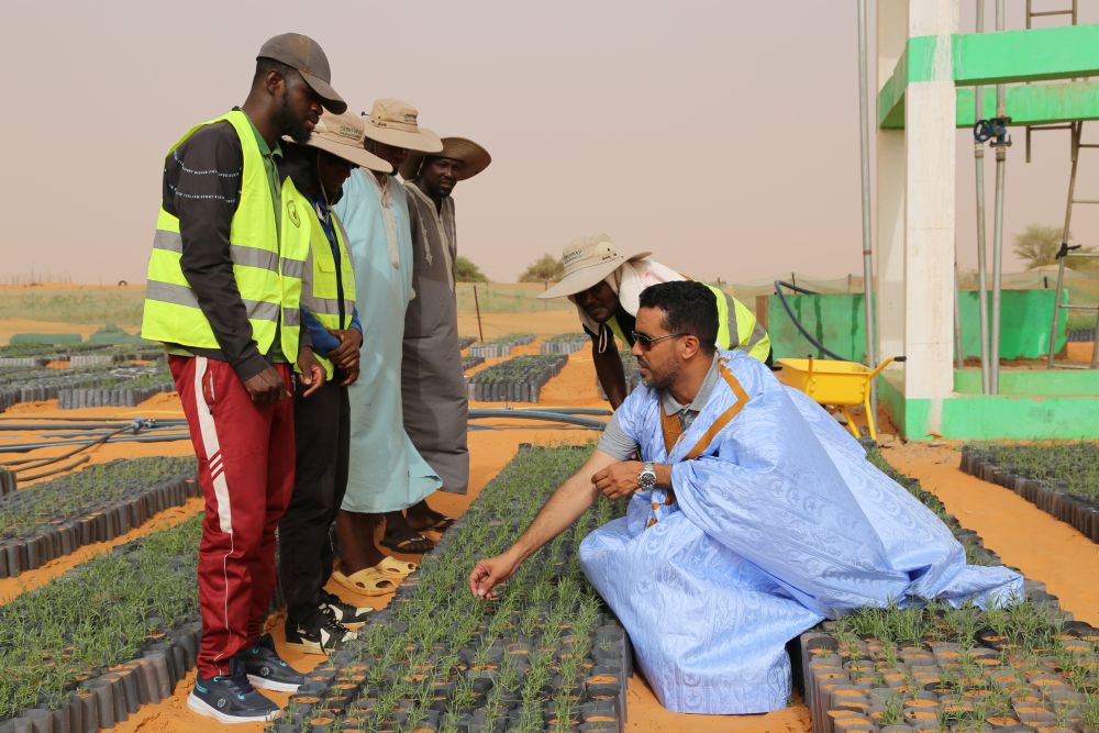 2025年5月22日,在毛里塔尼亞西部特拉扎區(qū)比爾·巴爾卡村,中非綠色技術公園毛里塔尼亞示范項目毛方協(xié)調(diào)員圖拉德·邁杜向工人傳授固沙植物種植技術。新華社記者 司源 攝