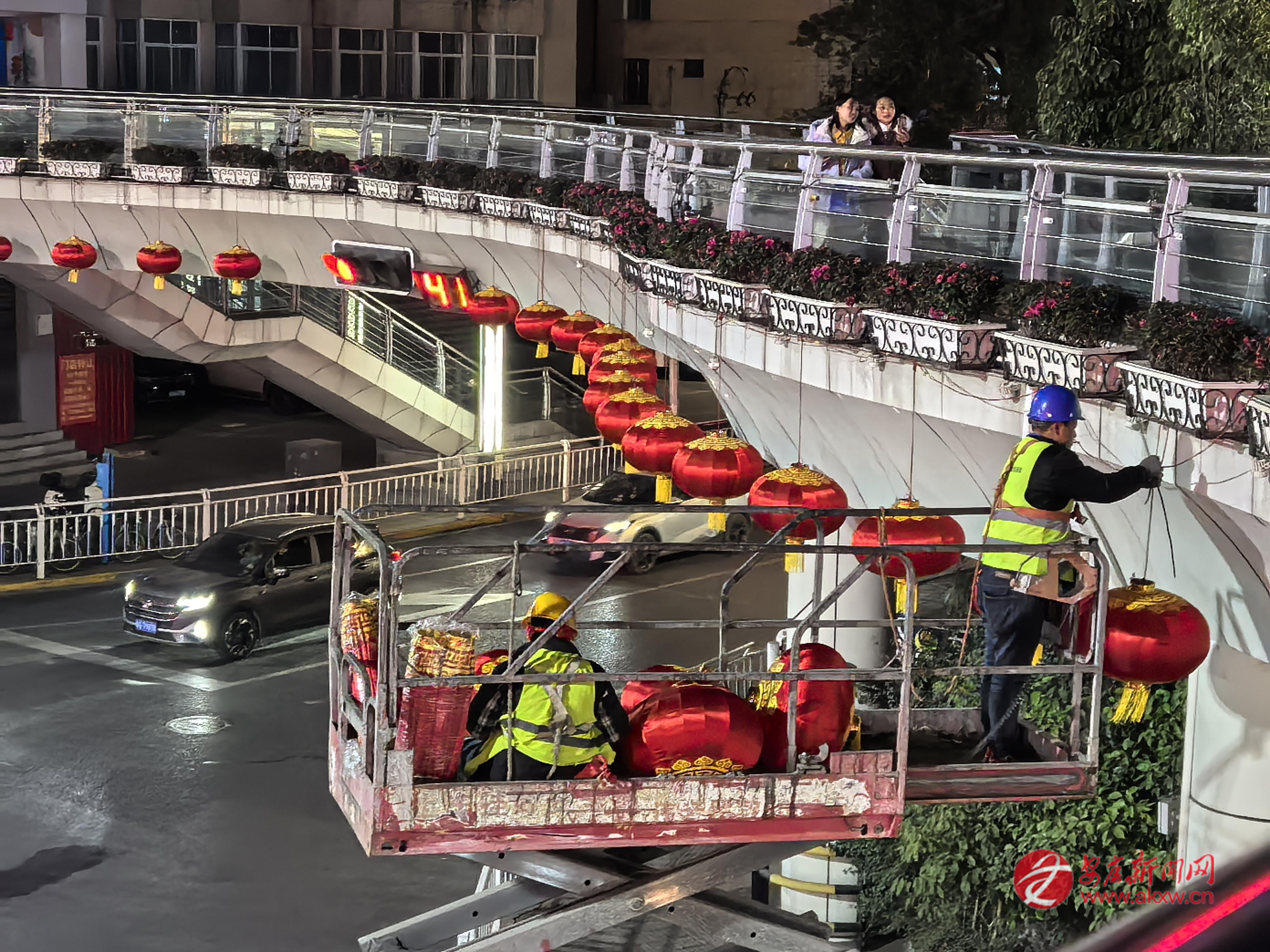 工人在安康城區(qū)大橋路、巴山路十字天橋安裝景觀燈,營(yíng)造節(jié)日氛圍。 記者 艾蓓 攝