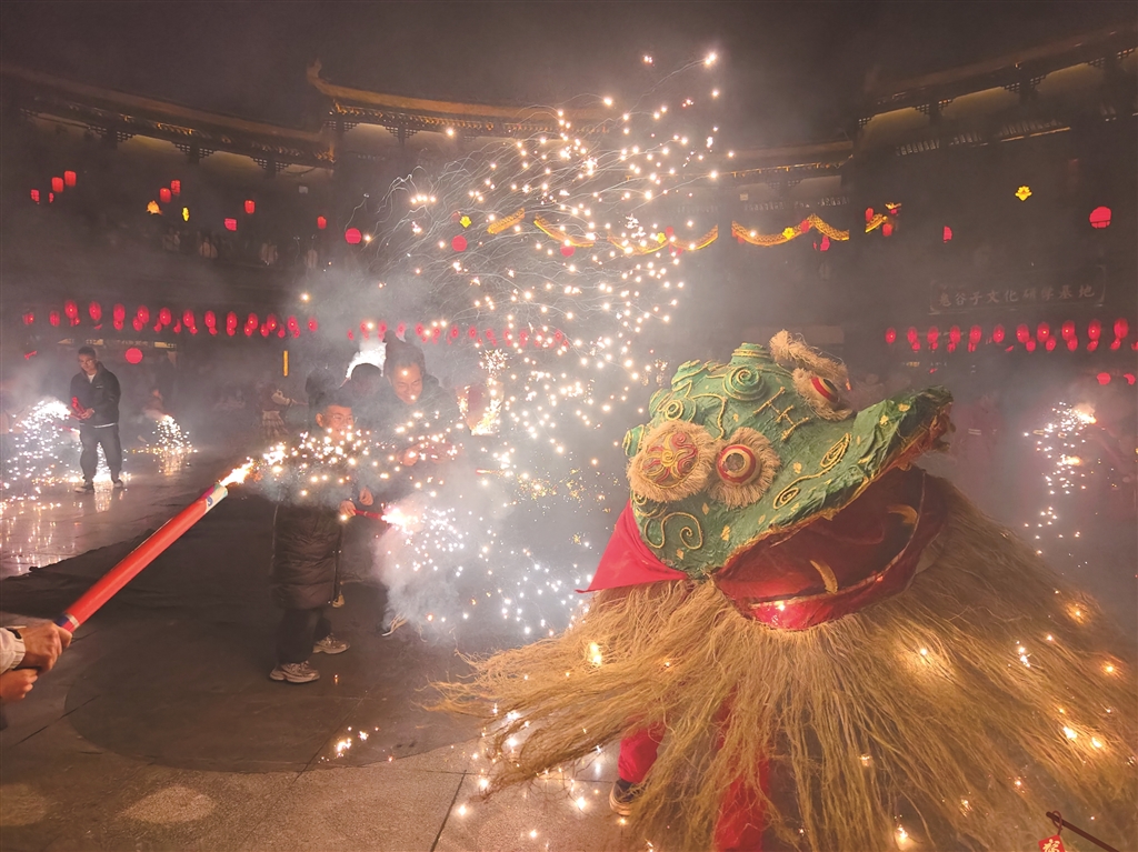 2月19日,石泉縣秦巴風(fēng)情園里的“燒獅子”引得眾人圍觀。舞獅人配合默契,游客點燃煙花筒,現(xiàn)場火花四濺、氣氛熱烈。楊勇 攝