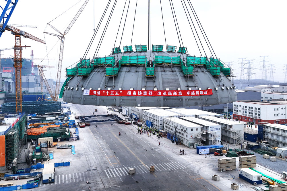 2026年2月10日在遼寧省葫蘆島市拍攝的徐大堡核電站1號機(jī)組核島鋼制安全殼頂封頭吊裝作業(yè)現(xiàn)場(無人機(jī)照片)。新華社發(fā)