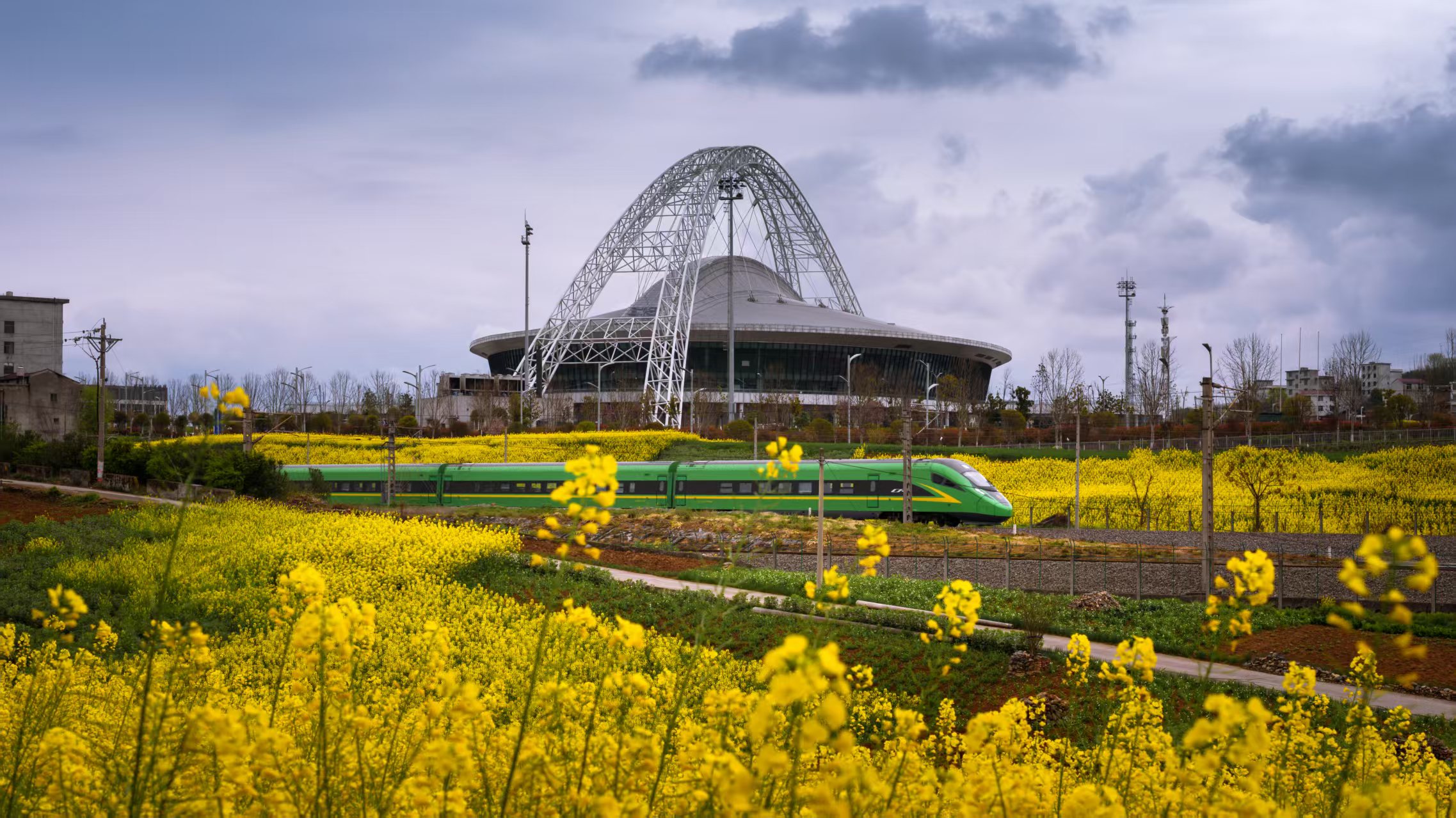 3月16日,安康市體育館前,金黃的油菜花海與飛馳的復(fù)興號(hào)列車相映成趣,盡顯春日生機(jī)。王坤侖 攝