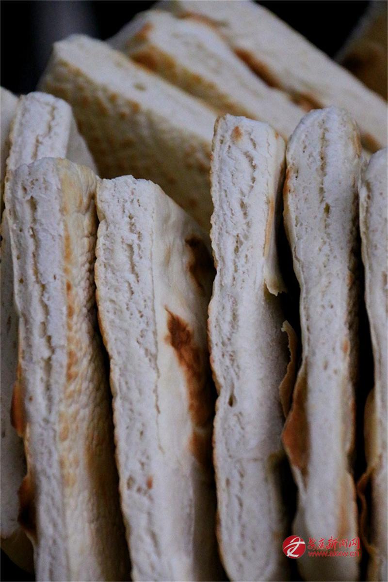 安康的牙牙兒饃是發(fā)面的。發(fā)面,在北方多用于蒸饅頭、包子,用來打饃且泡在湯里吃的,似乎不多見。安康人卻偏偏這么做了。面粉加了酵母,醒得恰到好處,不能太酸,也不能太生,揉成團,搟成圓,在鏊子上烙?;鸷蛞m中,兩面烙得焦黃,帶著些許褐色的斑點,像是虎背上的花紋,雖不如西安饦饦饃那般白凈,卻多了一股子麥香和火氣。