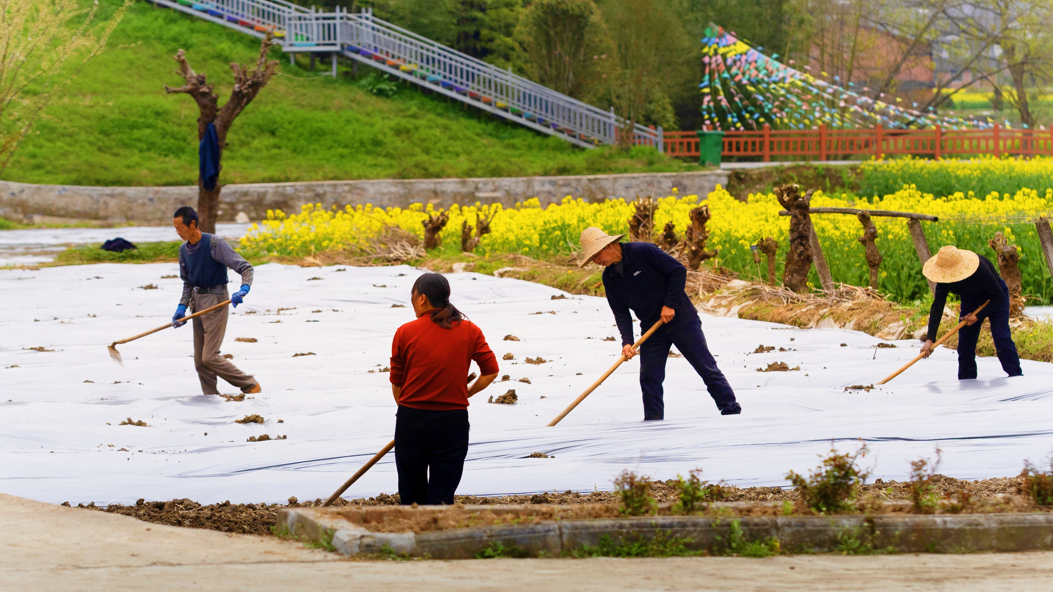 花海之上風光旖旎,花海之下農事正忙。趁著晴好天氣,當地農戶搶抓春耕有利時節(jié),田間地頭一派熱火朝天的忙碌景象。大家分工協(xié)作、有條不紊,忙著起壟整地、鋪設地膜,為紫長茄子移栽做前期準備工作。