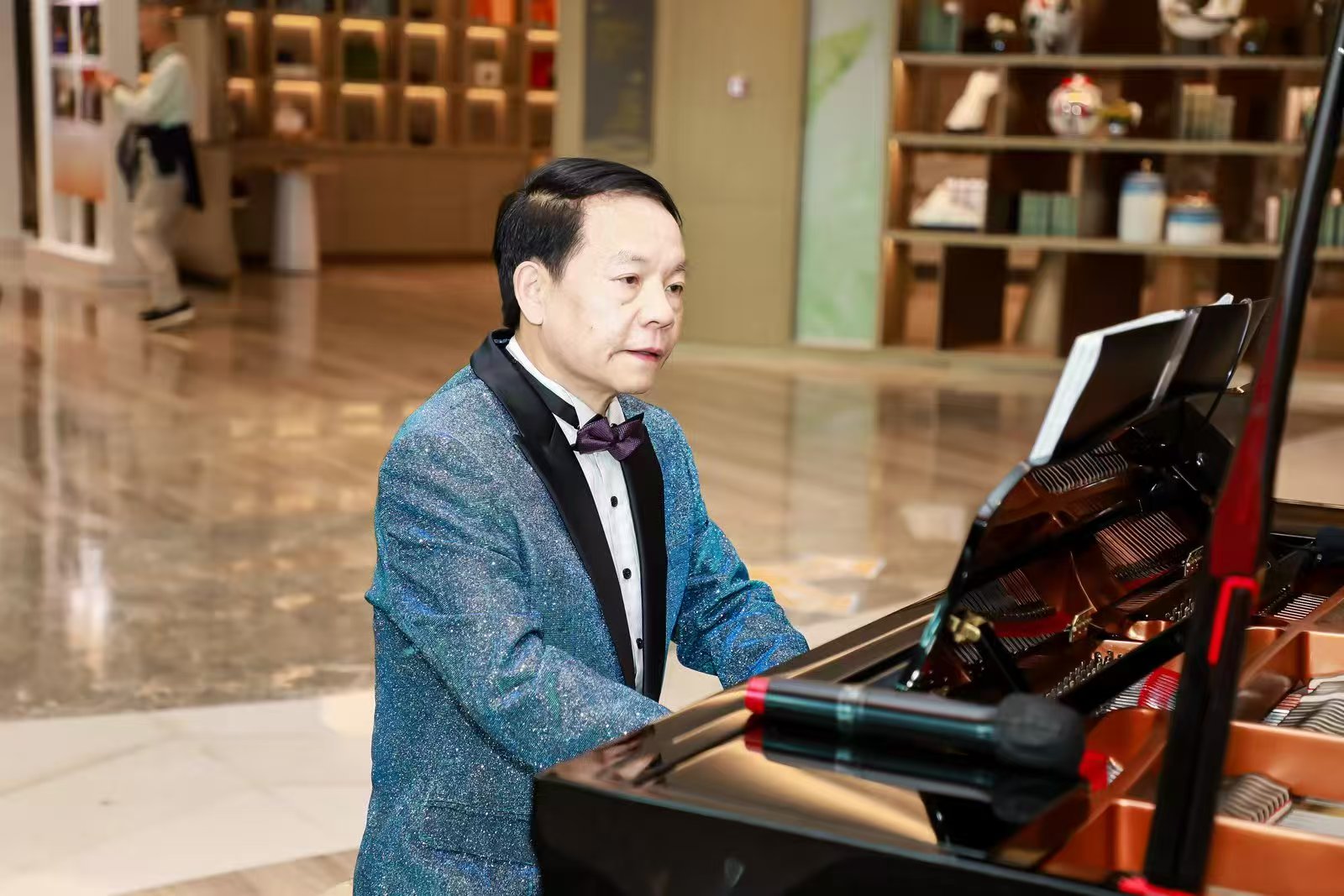 “第二點,共鳴腔體?!彼檬种篙p點自己的胸腔、喉部、口腔、頭腔,“這四個位置,就是你的聲音工廠。聲音不是從嗓子里硬擠出來的,是共振出來的。”講到興頭上,他干脆現場示范了一段《草原之夜》的引子,高亢透亮的男高音在劇場中回蕩,每一個音符都清晰得如同落在耳畔。喝彩聲尚未平息,他又邀出他的學生、平利縣文化館館長陳尚忠。師生二人即興合奏,琴聲與人聲交織,40余年的師生情誼在旋律中靜靜流淌。
