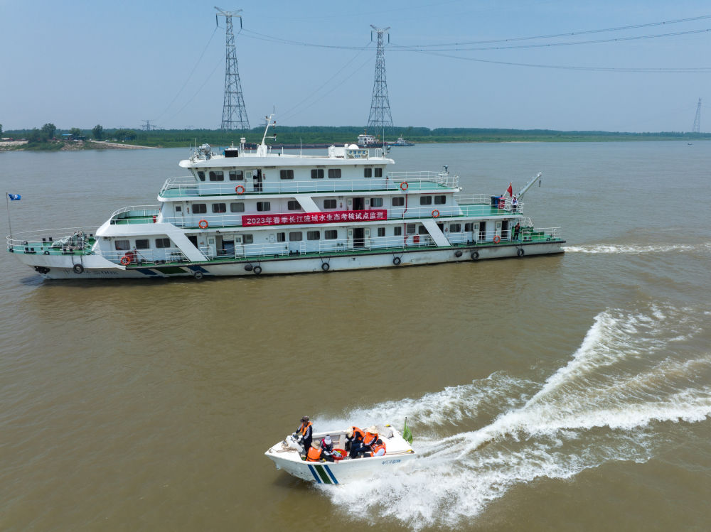 2023年5月12日,在湖北省赤壁市江段,來自長江流域生態(tài)環(huán)境監(jiān)督管理局等單位的監(jiān)測人員乘坐小艇前往監(jiān)測點(diǎn)位,為長江水生態(tài)“體檢”(無人機(jī)照片)。