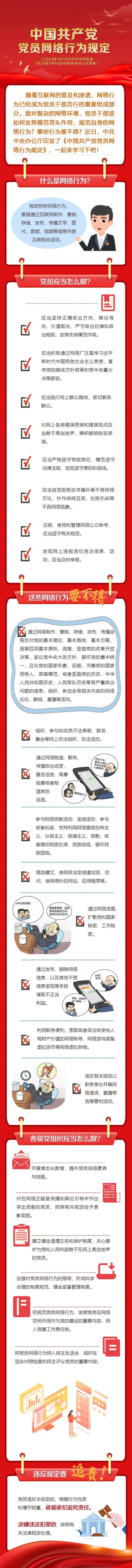 《中國(guó)共產(chǎn)黨黨員網(wǎng)絡(luò)行為規(guī)定》于2024年1月14日經(jīng)黨中央批準(zhǔn)、辦公廳發(fā)布后同日施行,它是第一部規(guī)范黨員網(wǎng)絡(luò)行為的黨內(nèi)法規(guī),是全體黨員使用網(wǎng)絡(luò)的根本遵循,共計(jì)5章31條。